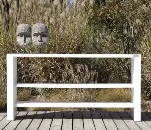 Mesa de apoyo grande, fabricada con durmientes, una consola versátil para proporcionar apoyo durante las comidas o para la organización. Disponible en blanco o castaño. Madera tratada en autoclave.